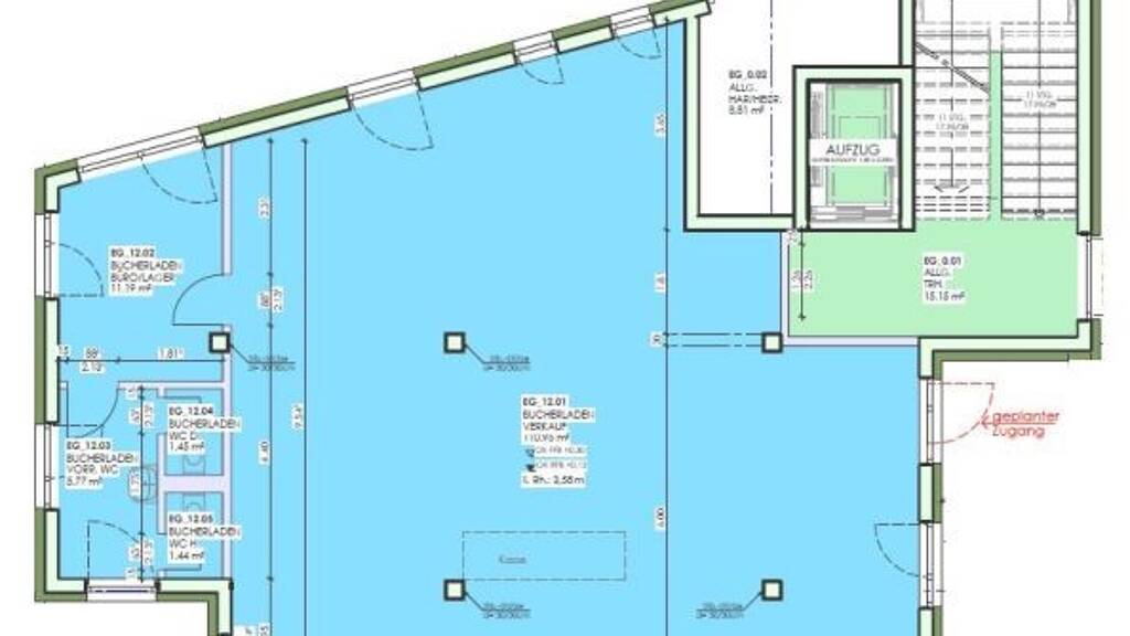 Im Erdgeschoss befindet sich die Laden- /Ausstellungsfläche. Hier ist geplant neben der großen Ladenfläche auch einen Lager- oder Sozialraum und zwei WCs zu erstellen. Die Fläche kann derzeit nach den Wünschen des Mieters aufgeteilt und ausgestattet werden.