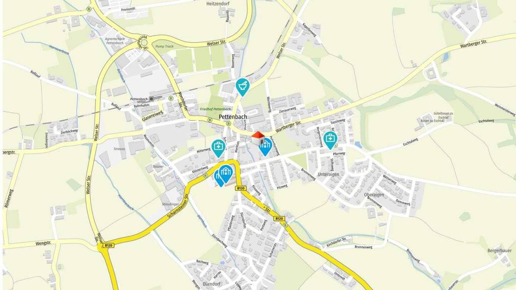 Das Wohnhaus befindet sich im Zentrum der Marktgemeinde Pettenbach. Es liegt in einer ruhigen Seitenstraße, ist aber durch seine zentrale Situierung perfekt, um sämtliche Einrichtungen des täglichen Bedarfs wie Nahversorger und Gastronomie fußläufig zu erreichen.
