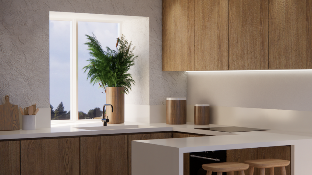 Das Obergeschoss besticht durch einen modernen, offenen Grundriss mit Küche, Ess- und Wohnbereich sowie einem praktischen Gäste-WC. Große Schiebetüren öffnen sich zu einer ruhigen Terrasse und erweitern den Wohnbereich nahtlos in den Außenbereich.