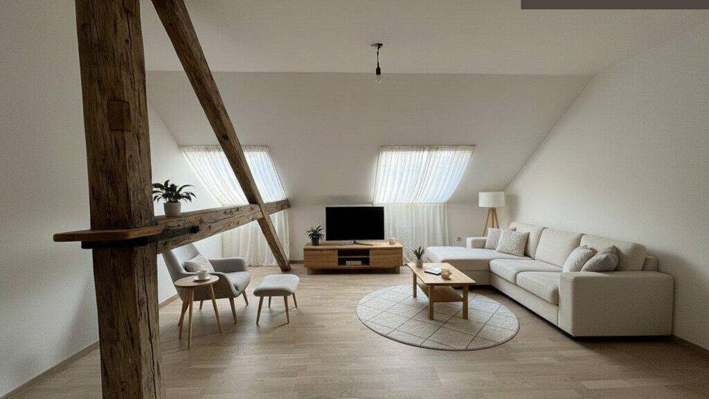 Besonders hervorzuheben ist der einzigartige Wohncharakter, der durch die Dachflächenfenster und die sichtbaren Holzbalken entsteht. Diese Kombination verleiht der Wohnung eine warme, gemütliche Atmosphäre und einen unverwechselbaren Altbaucharme.