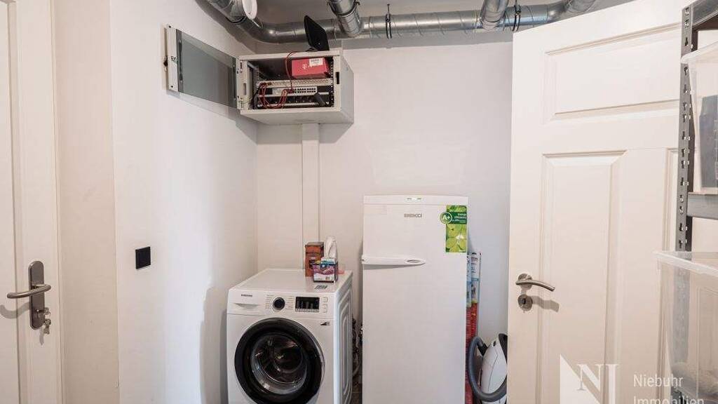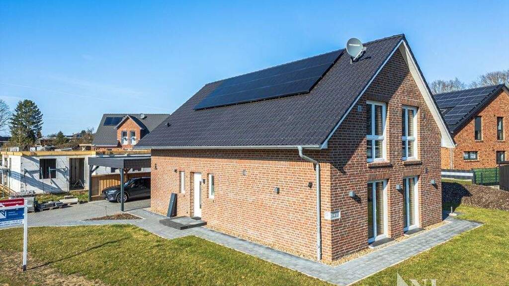 Dieses moderne Viebrockhaus aus dem Baujahr 2023 überzeugt mit einem durchdachten und besonders familienfreundlichen Grundriss sowie einer hochwertigen Ausstattung. Bereits beim Betreten des Hauses empfängt Sie ein großer Flur, von welchem aus das Gäste-WC mit Dusche, der HWR, ein Arbeitszimmer sowie die offene Holztreppe in das Dachgeschoss führt. Das Herzstück des Hauses bildet der offen gestaltete Wohn-, Ess- und Kochbereich, welcher durch große Fensterflächen lichtdurchflutet ist und einen direkten Zugang zu den Terrassen und in den Garten bietet. Die Küche ist funktional integriert und bietet ausreichend Platz für die moderne und helle Einbauküche, während der Wohn- und Essbereich großzügig geschnitten ist und eine helle freundliche Wohnatmosphäre schafft. In dem Dachgeschoss befinden sich ein geräumiges Elternschlafzimmer, welches über ein Ankleideraum erreichbar ist sowie zwei weitere gut geschnittene Zimmer, welche sich ideal als Kinder- oder Gästezimmer eignen. Das große Wohlfühlbad ist komfortabel ausgestattet und verfügt über eine Badewanne, eine bodentiefe Dusche sowie einen Handtuchtrockner. Ergänzend steht ein praktischer Spitzboden als zusätzlicher Stauraum zur Verfügung. Im Innenbereich unterstreichen Designbodenbeläge sowie anthrazitfarbene, großformatige Fliesen den modernen Charakter der Immobilie. Hochwertige weiße Holzinnentüren, eine massiv gefertigte Buchentreppe, überwiegend bodentiefe, abschließbare Fenster sowie elektrische Außenrollläden an allen Fenstern (außer im Flur) runden dieses attraktive Wohnangebot ab. Der Außenbereich ist ebenso ansprechend gestaltet wie das Wohnhaus. Ein großes, vom Zimmermann gefertigtes Doppelcarport bietet Platz für Fahrzeuge und Stauraum. Hinter dem Carport befindet sich ein massiver Abstellraum für Fahrräder und im hinteren Bereich auf dem Grundstück bietet ein Gartenhaus zusätzlichen Stauraum. Der angelegte Erdwall und der Stabgitterzaun runden das Gesamtangebot dieser Immobilie ab.