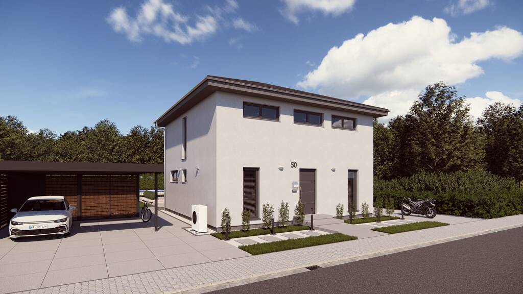 m Stil einer modernen Stadtvilla gehalten, überzeugt das Einfamilienhaus mit seinen rund 150 m² Wohnfläche und eignet sich ideal für Familien, die das Plus an Komfort genießen möchten. Im Erdgeschoss befindet sich der offene Wohn-Ess-Kochbereich, der dank der bodentiefen Fenster nicht nur in natürlichem Tageslicht erstrahlt, sondern auch einen direkten Zugang zum Außenbereich bietet. Die großzügige Küche verfügt über eine praktische Kochinsel und ist mit einer separaten Speisekammer ausgestattet, die optimalen Platz und zahlreiche Stauraumoptionen bereithält. Neben der Diele und einem Gästebad bietet das Erdgeschoss einen Hauswirtschaftsraum (HWR), welcher als Waschraum nutzbar ist. Im Obergeschoss befinden sich zwei geräumige Schlafzimmer sowie ein weiterer Raum, der sich ideal als Büro oder Hobbyraum eignet. Ein Highlight stellen sowohl das großzügige Bad inklusive Dusche und Badewanne sowie das Elternzimmer, welches über einen eigenen Ankleidebereich verfügt, dar. Das moderne Traumhaus kann optional mit einem Keller geplant werden, der zusätzlichen Stauraum ermöglicht.
