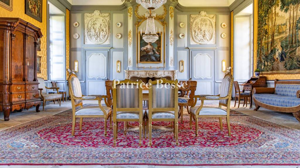 Inside, the chateau has conserved its original décor: cartouches, medallions, chimneybreasts, decorative window and door surrounds, wood panelling, marble and stone, while the size of the magnificent rooms as well as their floor-to-ceiling height add to the chateau's overall grandeur.