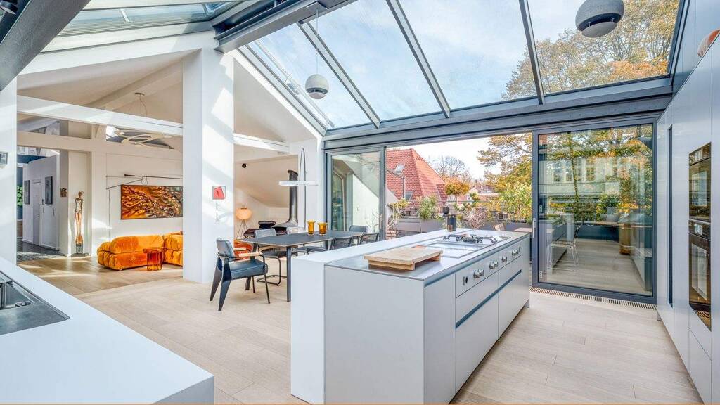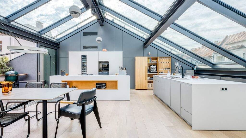Durch das verglaste Dach über dem Küchen- und Essbereich wird die Dachgeschoss-Wohnung mit natürlichem Licht durchflutet, während der integrierte Sonnenschutz an warmen Sommertagen für eine angenehme Atmosphäre sorgt. Die Raumbeleuchtung stammt von Occhio und diverse Designermöbel setzen Akzente in jedem Raum. Diese könnten auf Wunsch übernommen werden.