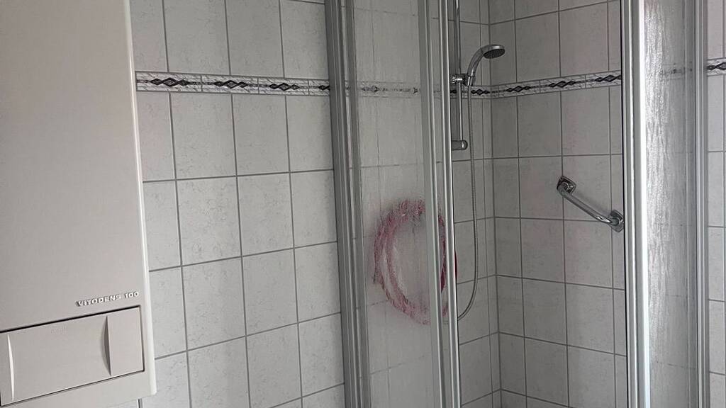 Das tageslichthelle Badezimmer bleibt unverändert, ist vollständig gefliest und mit einer Dusche ausgestattet.