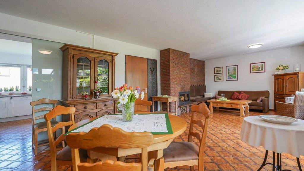 Das rund 36 m² große Wohn- und Esszimmer bildet das Herzstück des Hauses. Großzügige Fensterfronten öffnen den Blick in den nach Süden ausgerichteten Garten und schaffen eine helle, freundliche Atmosphäre. Eine große Sofalandschaft und ein großzügiger Esstisch finden hier mühelos Platz. An kühlen Tagen sorgt der Kamin für angenehme Wärme.