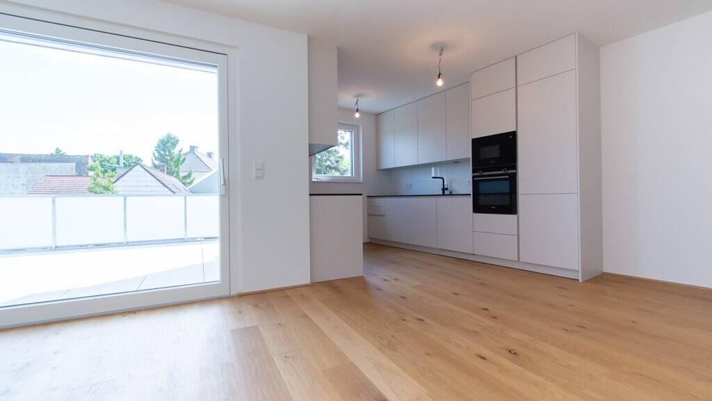 Sämtliche Räume sind über den ca. 12 m² großen Vorraum begehbar. Die ca. 39 m² große Wohnküche, ausgestattet mit einer hochwertigen Tischlereinbauküche und Marken-Geräten, bietet ausreichend Platz für einen Ess- und Wohnbereich. Die nach Süden ausgerichtete Terrasse/Balkon ist von der Wohnküche zugängig und erweitert den Wohnbereich an schönen Tagen um ca. 23 m².