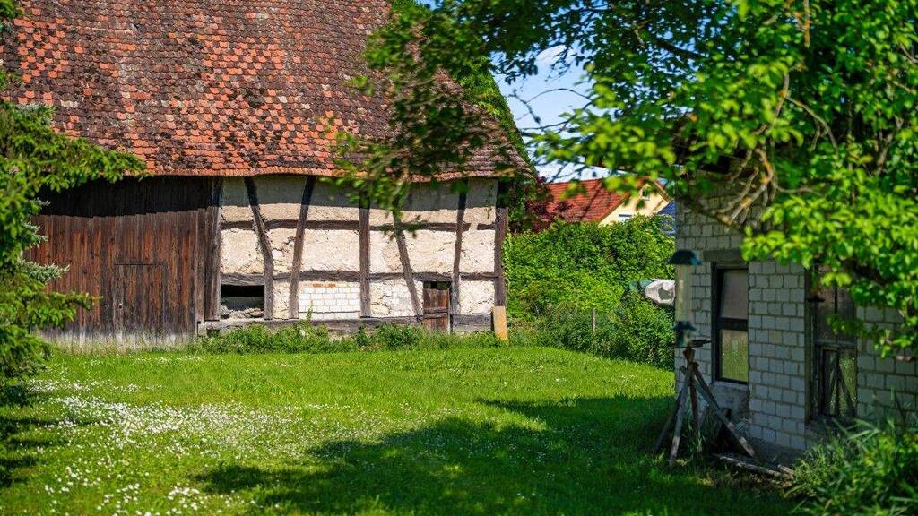 Am Eingang des Grundstücks befindet sich ein Wohnhaus mit zwei Stockwerken in renovierungsbedürftigem Zustand. Direkt dahinter eröffnet sich das weitläufige Grundstück, das aktuell mit mehreren Scheunen und Nebengebäuden bebaut ist. Diese Gebäude stammen aus früheren landwirtschaftlichen Nutzungen und verleihen dem Areal einen charmanten, traditionellen Bauernhofcharakter.