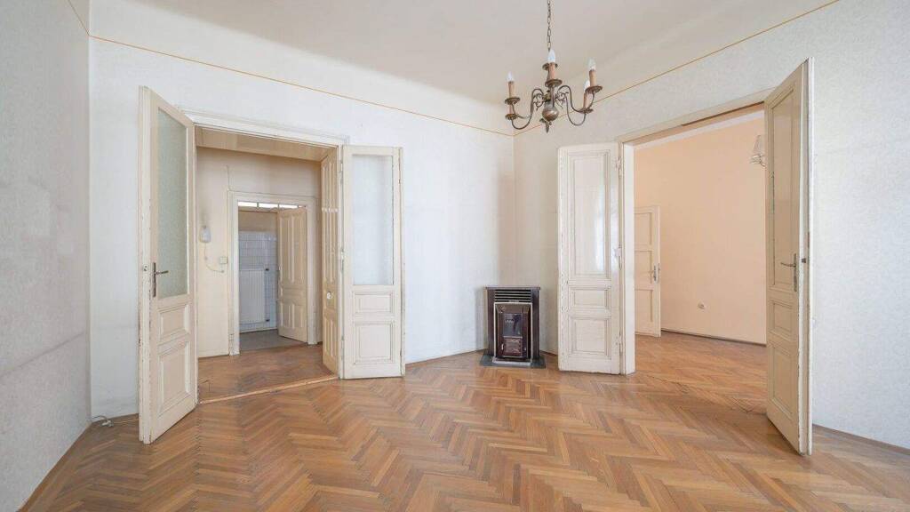Die Wohnung befindet sich im 2. Stock (ohne Lift) und in einem sanierungsbedürftigen Zustand. Sie bietet sehr viele Elemente eines Stilaltbaus: