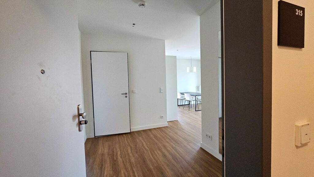 - Vinyl-Dielen (Holzoptik) in den Zimmern, gefliestes Badezimmer - Spritzschutz in Steinoptik (Küche), Fliesen im Bad - Glas-Duschabtrennung, Hänge-WC, Strukturheizkörper - Multimediaanschluss im Raumteiler
