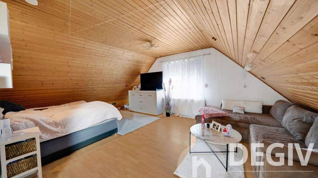 Im Erdgeschoß befindet sich das geräumige Wohnzimmer, eine Küche, ein Bad, ein Schlafraum und ein weiterer flexibel nutzbarer Raum. Im Obergeschoss gibt es drei Räume. Dazu ein WC. Der Spitzboden über dem Obergeschoss bietet reichlich Stauraum und könnte noch zusätzlich ausgebaut werden, da man sich dort aufrecht bewegen kann.