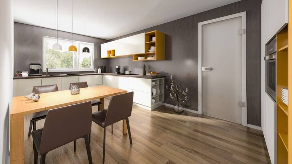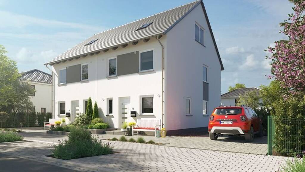 Eine Doppelhaushälfte bietet Ihnen die Vorteile eines normalen Einfamilienhauses, benötigt aber weniger Grundstücksfläche. Die effiziente Raumaufteilung des Doppelhaus Mainz tut ihr Übriges dazu: Im Erdgeschoss erstreckt sich das geräumige Wohnzimmer mit genügend Platz für Entspannung und Familienaktivitäten. Mit einem schönen Esstisch machen Sie das Wohnzimmer zum zentralen Treffpunkt mit Ihren Lieben. Die bodentiefen Fenster verwöhnen Sie mit angenehmen Tageslicht und einem Blick ins Grüne.