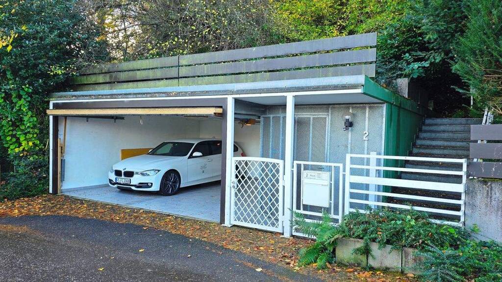 Unterhalb des Hauses befindet sich eine große, massive Doppelgarage. Der Zugang zum Haus erfolgt über eine Treppe – ein charmantes Detail, das die erhöhte Lage mit all ihren Vorteilen ermöglicht, jedoch für gehbeeinträchtigte Personen nicht geeignet ist.