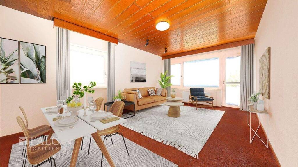 Die ca. 76?m² große Wohnung bietet einen hellen Wohn- und Essbereich mit Zugang zum überdachten Balkon - perfekt, um entspannt die Zeit im Freien zu genießen. Weiterhin gehören ein Schlafzimmer mit Teppichboden, ein Kinder- oder Arbeitszimmer, eine funktionale Einbauküche sowie ein Badezimmer mit hellen Fliesen zur Ausstattung. Die praktische Raumaufteilung sorgt für ein angenehmes Wohngefühl.