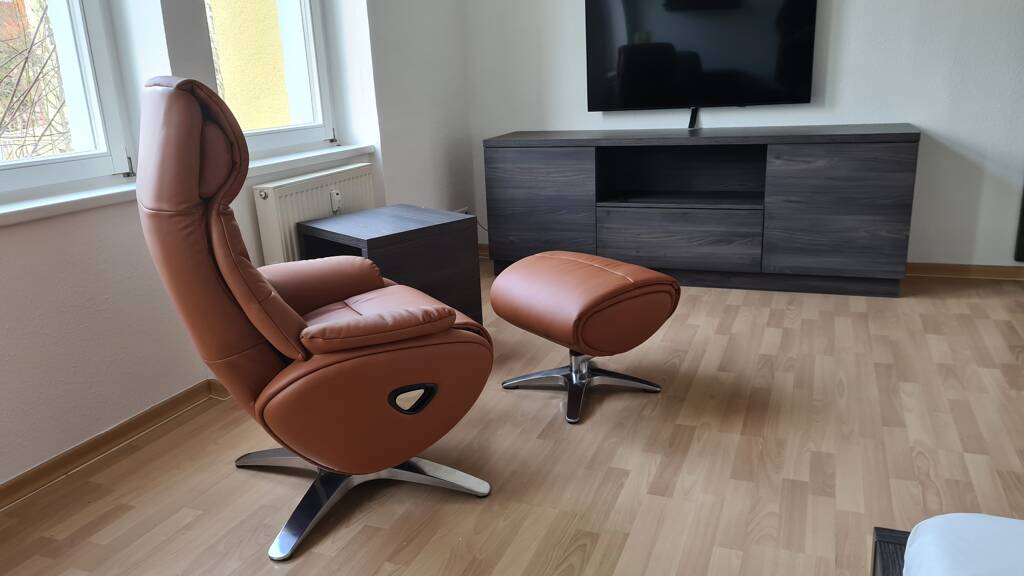 Designfußbodenbelag, großer TV Relaxesessel, TV 50 Zoll, Sat-TV, großes Sideboard, 1,40m breites französisches Bett, Schreibtisch, Garderobe usw. + Accessoires zum Beispiel von Kare Design München