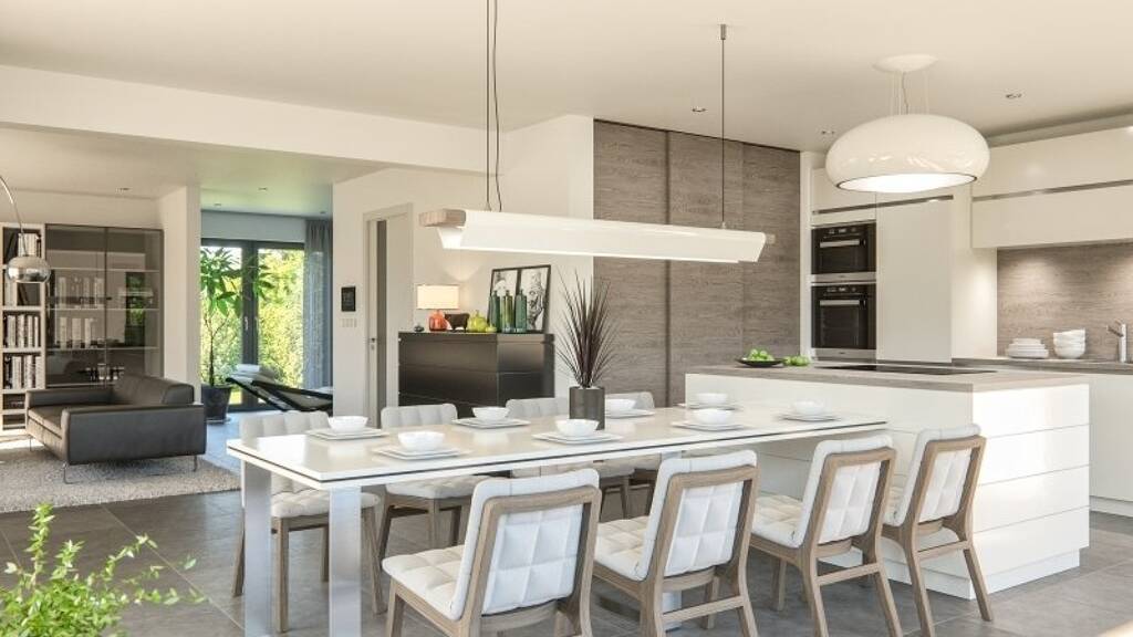 Eine Bauhausstil mit hoher Funktionalität Unser Haus Sydney ist ein imposantes Haus in kubischer Flachdacharchitektur. Große Glasfronten und klare, markante Formgebung sind prägend für die Ästhetik dieses Anwesens. Anbauten wie Carport, überdachte Terrasse und Loggia setzen formschöne und gleichzeitig nützliche Akzente. Auffallend weitläufig und repräsentativ beeindruckt der über 63 m² große Raumkombination von Kochen, Essen und Wohnen, in dem ein eigener Bereich zum gemütlichen Relaxen zur Verfügung steht. Eine überdachte Terrasse verbindet Haus und Garten - ein schattiger Platz, an dem man auch bei einem warmen Sommerregen in der Natur entspannen kann.