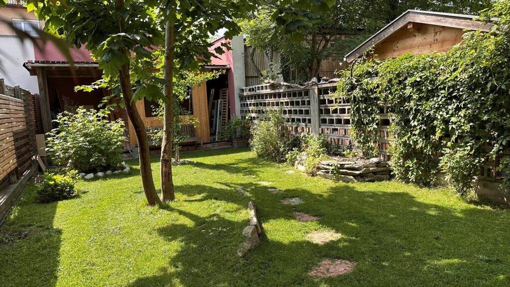 Der idyllische Garten hat eine Fläche von ca. 95,00 m², ist komplett eingegrenzt, herrlich begrünt und mit einem neuen, großzügigen Gartenhaus bestückt - eine Hälfte für die Gartengeräte, die andere Hälfte zum Chillen für die Kinder, etc.
