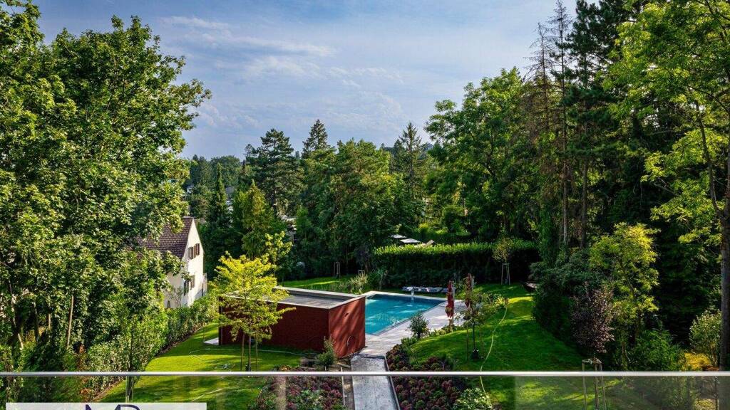 Der etwa 73 m² große Wohn- und Essbereich bildet dabei das Herzstück der Wohnung. Eine elegante Glasfront führt auf die rund 28 m² große, südseitige Terrasse, von der aus sich ein schöner Blick in die weitläufige, parkähnliche Gartenanlage eröffnet. Dort befinden sich ein ca. 6 × 12 m großes Outdoor-Pool mit einem etwa 28 m² großen Poolhouse - ein stilvoller Rückzugsort für warme Tage.