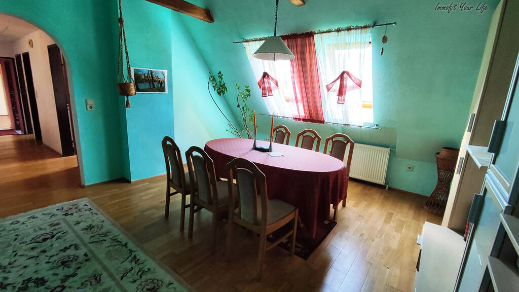 Aufgrund der Fläche – es sind zwei Geschosse ausgebaut – würde sich das Haus für eine größere Familie eignen. Auch ist es möglich die Eingänge getrennt voneinander zu begehen. Im ersten Obergeschoss berindet sich eine kleine Wohnung mit ca. 50 m² Wohn(Nutzfläche) und folgender Raumaufteilung: 1 Vorraum, 1 Schlafzimmer, 1 Wohn- Essbereich mit Küche sowie 1 kleines Bad mit Dusche und WC.