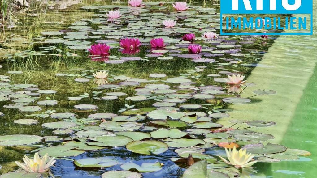 Im unteren Teil des Grundstücks befindet sich ein naturbelassener aber gepflegter Bereich mit einem Biopool samt eleganter Lärchenholzterrasse. Der Pool wird von einem eigenen System gespeist und beherbergt verschiedene Arten von Seerosen sowie Schilf ein idyllischer Rückzugsort direkt vom Wohnzimmer erreichbar. Der Biopool ist natürlich auch zum Schwimmen geeignet.