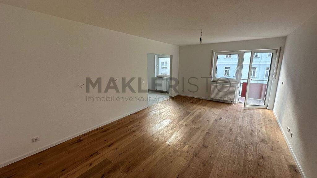 umfassend modernisiert 2026 // Balkon // Einbauküche mit Geschirrspüler in einer offenen Küche // innenliegendes Bad mit Badewanne & Dusche // Handtuchheizkörper // Parkett im Landhausstil // moderne großformatige Fliesen in Bad und Küche // Deckenspots // Gemeinschaftsgarten // Kellerabteil