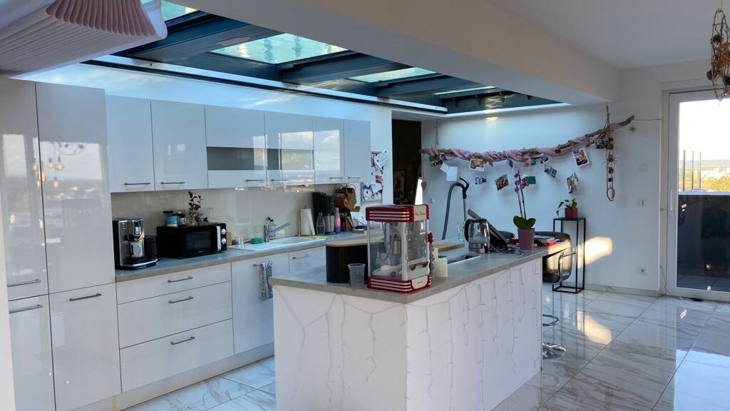 In einem ebenso sehr ansprechenden Design ist die Küche gehalten. Diese besteht aus einer Kochinsel mit Herd, Backofen, Dunstabzug und einer Küchenzeile mit Dampfgarer, Geschirrspüler, Kühlschrank, Tiefkühlfächer und sämtlichen Kästen. Alle weiteren Möbel und Dekorationen, welche auf den Fotos ersichtlich sind, sind nicht inbegriffen.