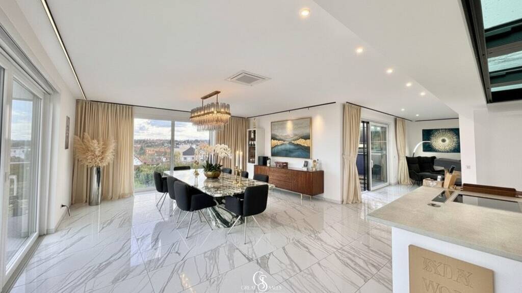 Dieses Loftartige-Penthouse besticht besonders durch ihre luxuriöse und sehr hochwertige Ausstattung! Es bietet Ihnen auf einer Wohnfläche von rd. 142m² einen Eingangsbereich, einem großen Wohn/Essbereich, eine Top Küchenzeile, einem Essbereich, einem Arbeitsbereich, einem Schlafbereich, zwei Bäder, getrenntes WC und gleich drei barrierefreie Terrassen. Das Highlight ist das Pool auf der traumhaften Dachterrasse über der Wohnung, welches am Boden aus Glas besteht und man von der Küche aus hinauf hindurch schauen kann und das Gefühl vermittelt, selber in einem Aquarium zu sein. Auf der teilüberdachten Dachterrasse im 7.OG erleben Sie außerdem einen unvergleichlichen 360 Grad Rundum-Fernblick in Richtung Graz, dem Schöckel oder auch in den Süden bis nach Slowenien. Ob Wellness, Sauna, Poolparty, Grillen oder einfach nur die Sonne genießen, sie lässt keine Wünsche offen.