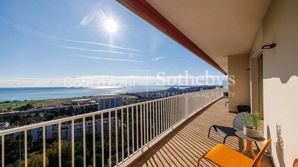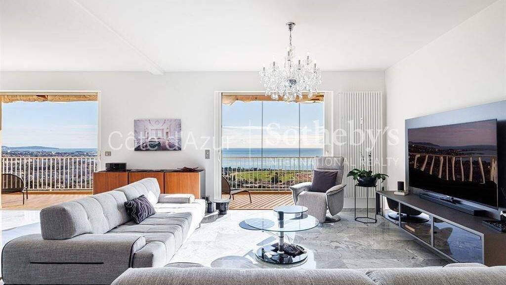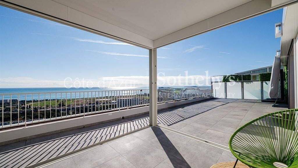 An der Spitze des Domaine du Loup bietet dieses 135 m² große Penthouse (Loi Carrez) mehr als 100 m² Außenflächen mit 180° Panoramablick auf das Mittelmeer von Cap Ferrat bis Cap d'Antibes, einschließlich des Hippodroms der Côte d'Azur.