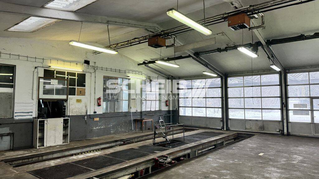 Werkstatt: - Raumhöhe in der Werkstatt Traufe 3,56 m und First 4,90 m - Fliesenboden - 3 große Sektionaltore Breite 2,87 m Höhe 3,29 m - verschiedene Bodenbeläge wie massiver Betonboden und robuste Steinfliesen - überdachter Zugang zu den Sektionaltoren - hell durch umlaufendes Fensterband - Handwaschbecken - Sozialräume mit Waschbecken und Spinds für Mitarbeiter - mit Pkw und Lkw befahrbar - 2 große Gruben - Hubstempel - Ölfeste Wanne - Heizung über Umluft Heizgeräte - Neonbeleuchtung