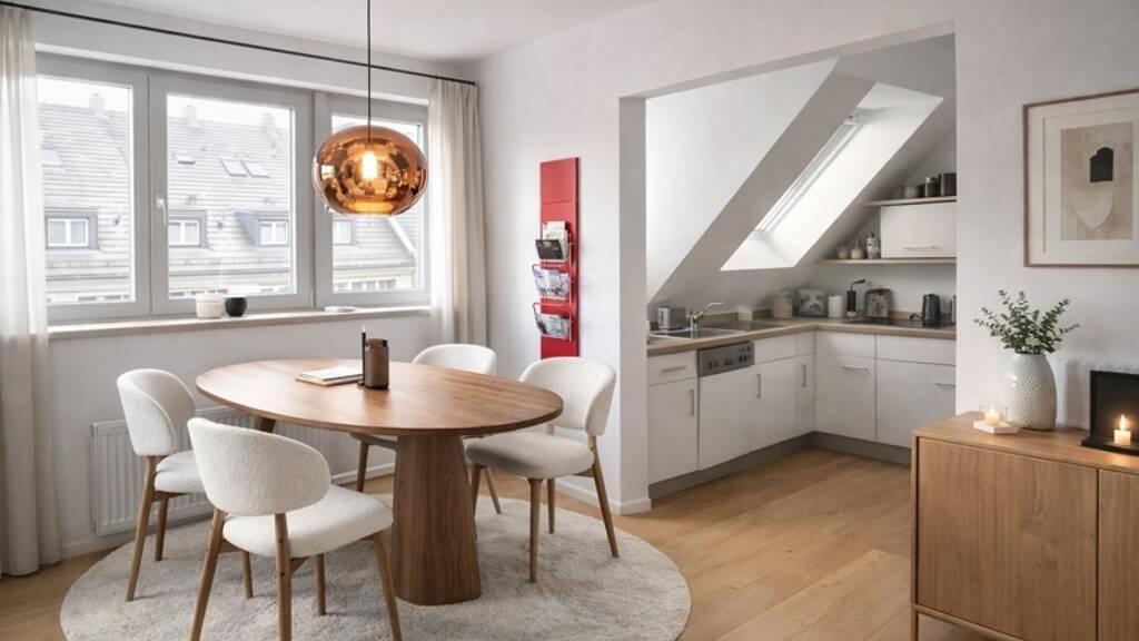Der Wohn-Essbereich mit offener Küche überzeugt durch seine freundliche Atmosphäre: Zwei nach Westen ausgerichtete Fenster sorgen für viel Tageslicht und verleihen dem Raum zusammen mit der hell gestalteten Küche eine angenehme Wohnqualität. Die individuell gestaltete Treppe führt von hier in das Obergeschoss und unterstreicht den besonderen Maisonette-Charakter der Wohnung.
