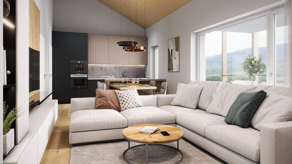 Beheizt werden diese in den kalten Wintermonaten über eine Wärmepumpe durch die Fußbodenheizung und in den warmen Sommermonaten auch gekühlt. Großflächige Fenster schaffen eine harmonische Verbindung zwischen Innen- und Außenbereich, wodurch natürliches Licht den Raum durchflutet und einen einladenden, offenen Charakter schafft.