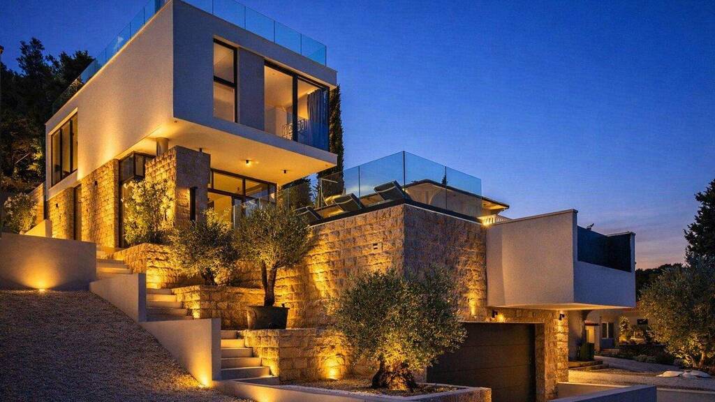 Mediterrane Bepflanzung mit Olivenbäumen, stilvolle Außenbeleuchtung und zwei Garagenstellplätze runden das Gesamtbild ab.