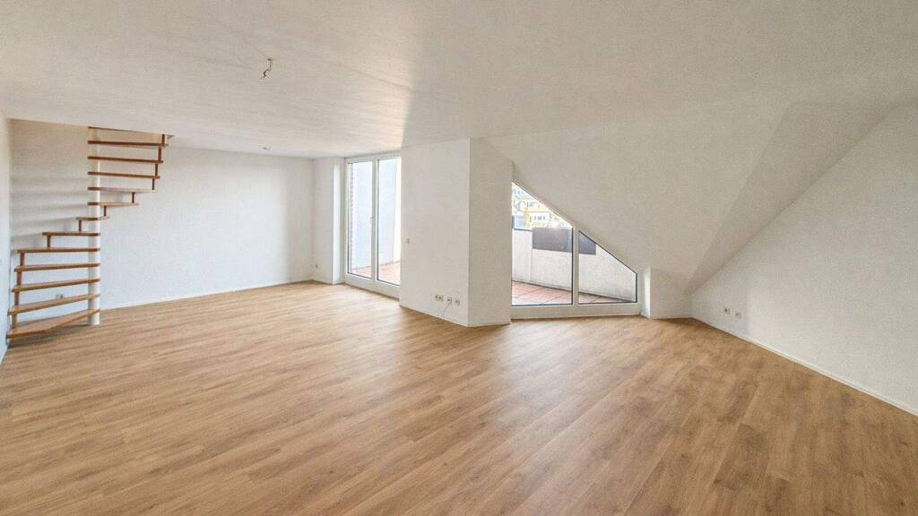 Die Dachgeschosswohnung auf zwei Ebenen präsentiert sich äußerst großzügig. Auf ca. 104 m² Wohnfläche verteilen sich drei Wohn- und Schlafräume, Küche, zwei Bäder und Loggia.