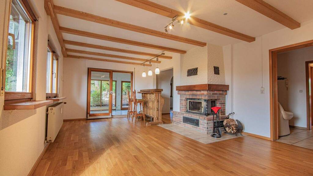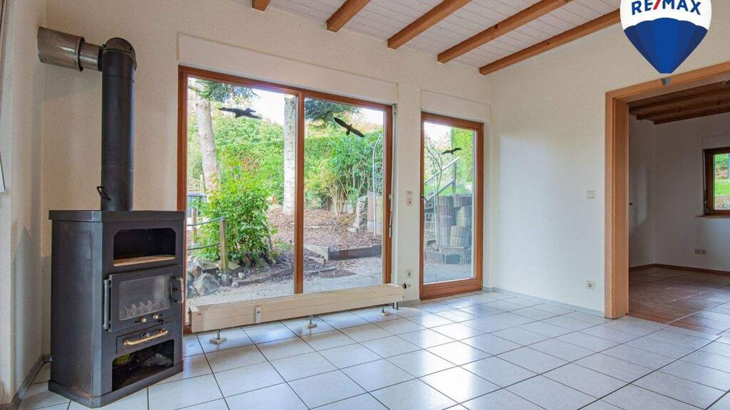 Wohnbereich mit einem schönen Ofen, der für eine behagliche Atmosphäre sorgt. Die angrenzende Küche ist mit einer Einbauküche ausgestattet und bietet ausreichend Platz zum Kochen. Ein weiteres Zimmer kann ideal als Esszimmer genutzt werden. Vom Wohn- und Esszimmer gelangt man in den unbeheizten Wintergarten mit Ofen, von dem aus sich die Terrasse und der Garten erreichen lassen.