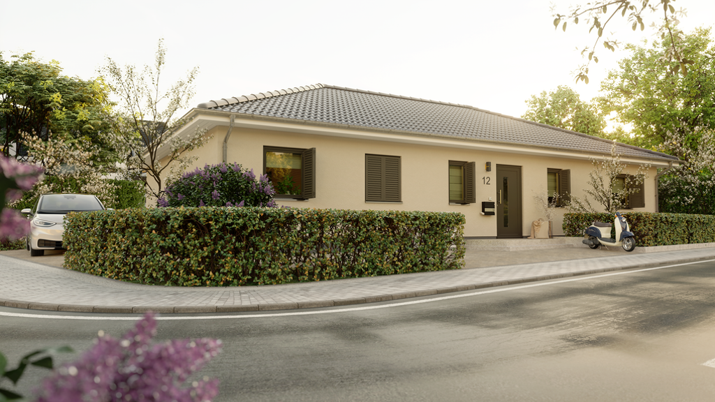 Bungalow 131 Familienleben auf einer Ebene - Der Bungalow 131 hat es in sich – 5 Zimmer, zwei Kinderzimmer und zwei Bäder – viel Wohnfläche und clever nutzbarer Stauraum für die ganze Familie. Die kluge Raumaufteilung bietet eine große Wohnküche in der Sie mit ihren Lieben Freizeit und Essen genießen können. Das traumhafte Wohnzimmer mit seinen großen Fenstern ist der perfekte Ort zum Entspannen, bietet freien Blick in Ihren Garten und mit wenigen Schritten sind Sie auf Ihrer Terrasse im Grünen.