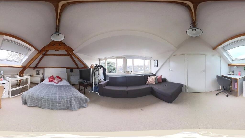 the room is currently arranged as a bedroom with a sitting area, but could easily serve as a master bedroom, studio or multifunctional space. practical storage space is available in the knee walls.