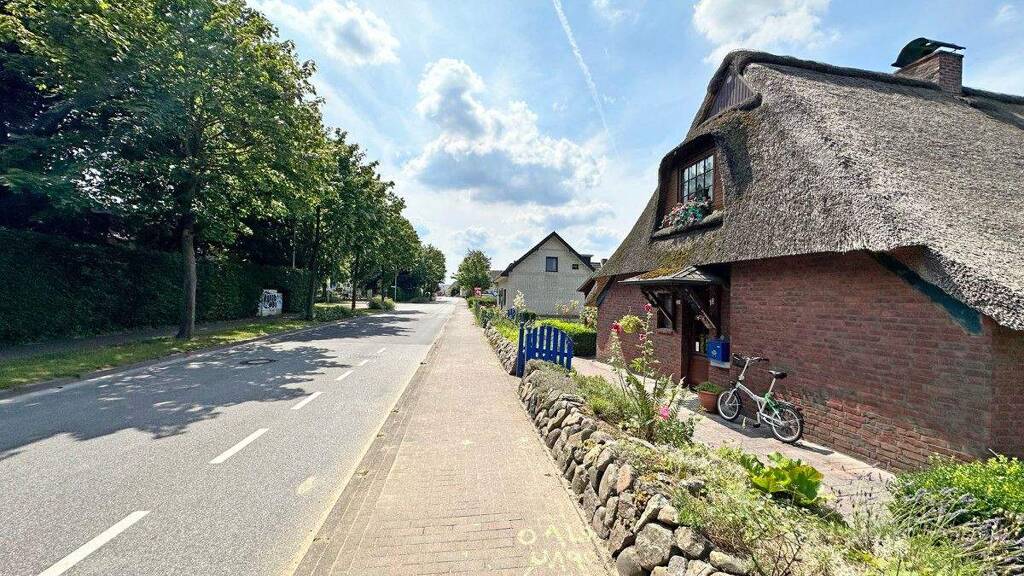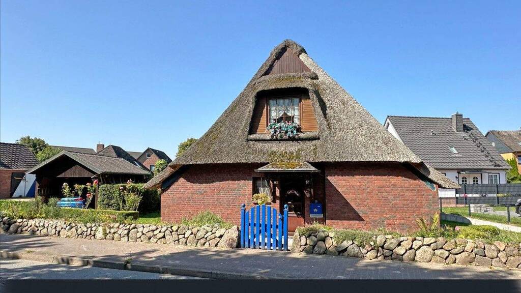 Die charmante Reetdachkate, ursprünglich ca. 1790 erbaut, wurde 1980 kernsaniert und 1996 durch einen Anbau im hinteren Bereich erweitert. Auf einem idyllischen Grundstück von etwa ca. 816 m² bietet das Haus im Erdgeschoss rund 107 m² Wohnfläche. Im Dachgeschoss befinden sich drei behagliche Räume, die jedoch nicht zur offiziellen Wohnfläche zählen.