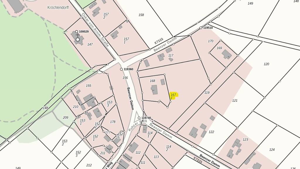 Das Baugrundstück mit einer Fläche von 7.788 m² liegt in der Dorfmitte und ist ortsüblich erschlossen - straßenseitig liegen Strom, Telekommunikationsleitungen und Wasser an. Der auf dem Grundstück befindliche Feuerlöschteich ist mit einer Fläche von 1.100 m² an die Gemeinde Nordwestuckermark verpachtet.