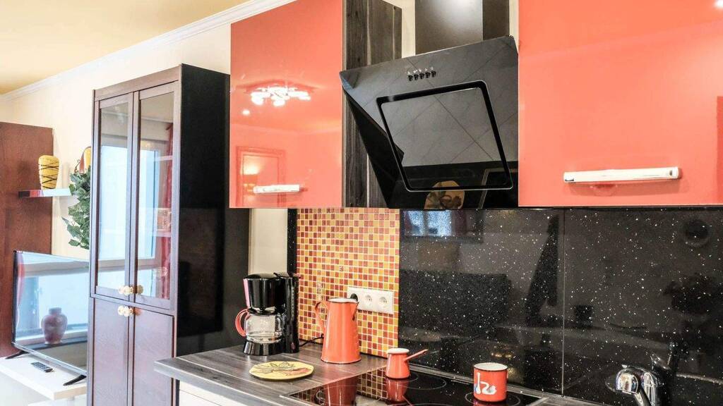 Voll eingerichtete Küche mit Ceranfeld und Backofen, Kühlschrank mit Tiefkühlfach, sowie mit einem Eßplatz.
