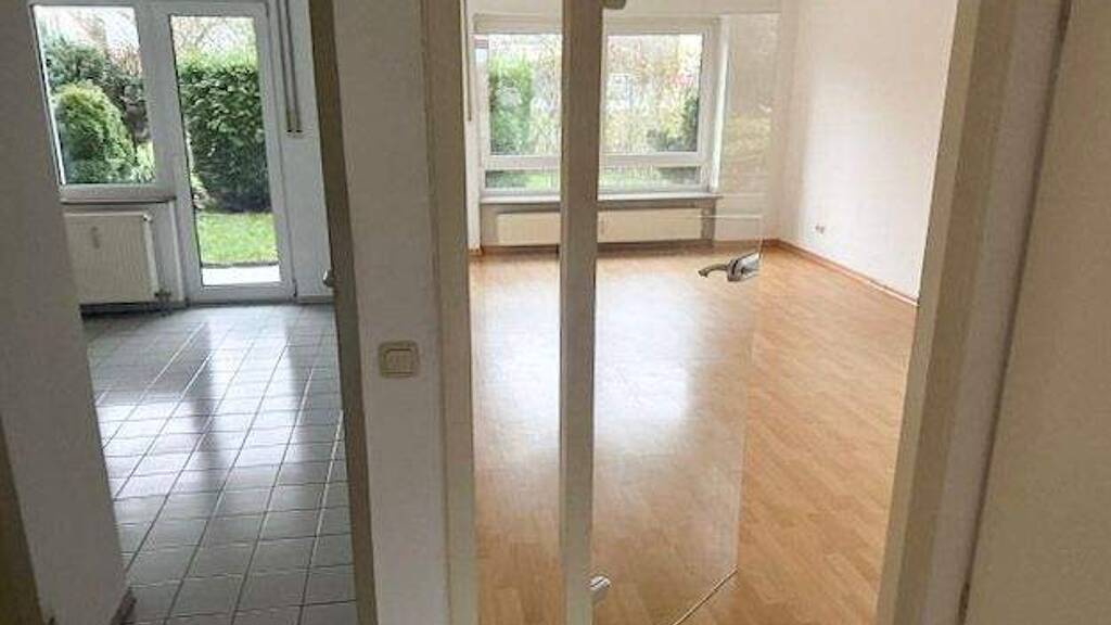 Die Wohnung verfügt über eine praktische Raumaufteilung mit Zugang zur Terrasse sowohl vom Wohnzimmer als auch von der Küche. Die Wohnräume sind mit Laminat ausgestattet, während Flur, Bad und Küche gefliest sind und damit pflegeleicht bleiben.