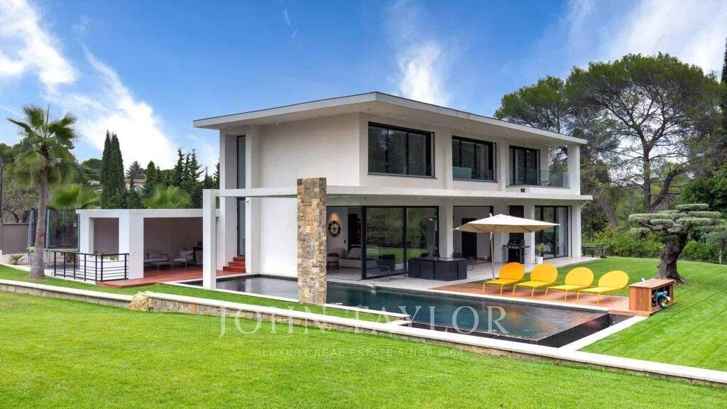 Eine neue Immobilie von 295 m2 im zeitgenössischen Stil, ideal gelegen in einer ruhigen Gegend zwischen Mougins und Valbonne in der Nähe von internationalen Schulen. Die Villa verfügt über 4 Schlafzimmer en suite, von denen eines zusätzlich mit privatem Zugang ausgestattet ist.