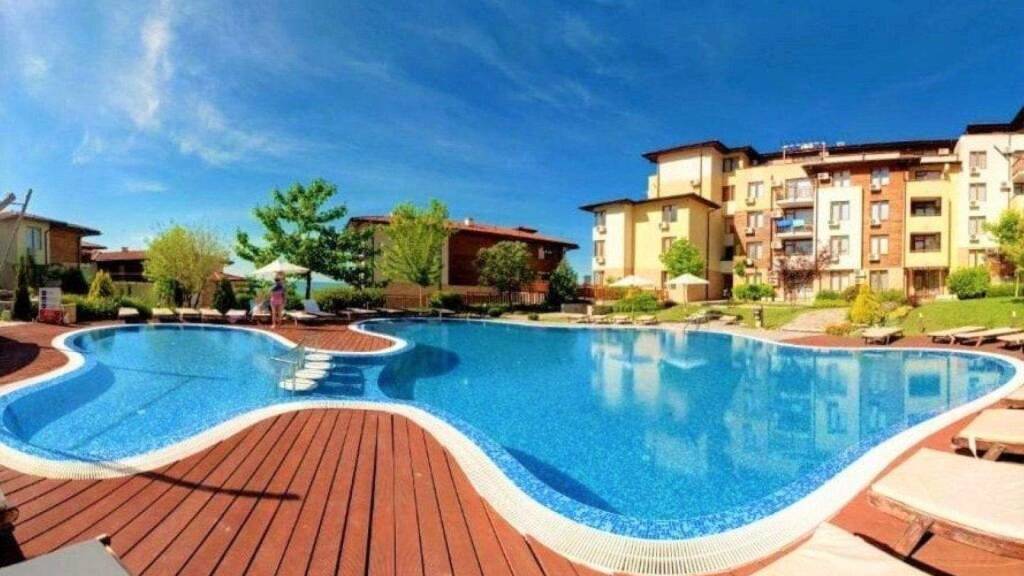 Die Anlage zählt zu den bekanntesten und hochwertigsten Resorts an der bulgarischen Schwarzmeerküste. Sie liegt direkt am feinen Sandstrand, harmonisch eingebettet zwischen grünen Hügeln und dem Meer, und bietet einen spektakulären Panoramablick auf die Bucht von Sonnenstrand.