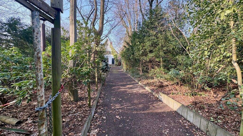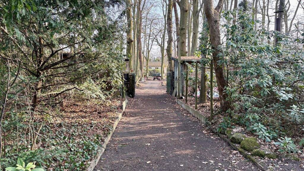 Im vorderen Bereich zur Straße findet sich Baumbestand, der den Weg zum hinteren Teil des Grundstücks säumt.