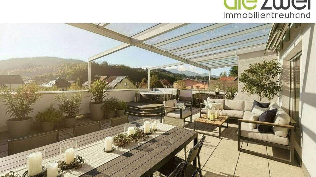 Die Terrasse ist teilweise überdacht und somit vielseitig nutzbar – bei Sonne, Wind oder leichtem Regen. Dank der perfekten Ausrichtung genießen Sie den ganzen Tag über Sonne und spektakuläre Sonnenuntergänge am Abend. Ihre ganz persönliche Oase mitten in Feldkirch.