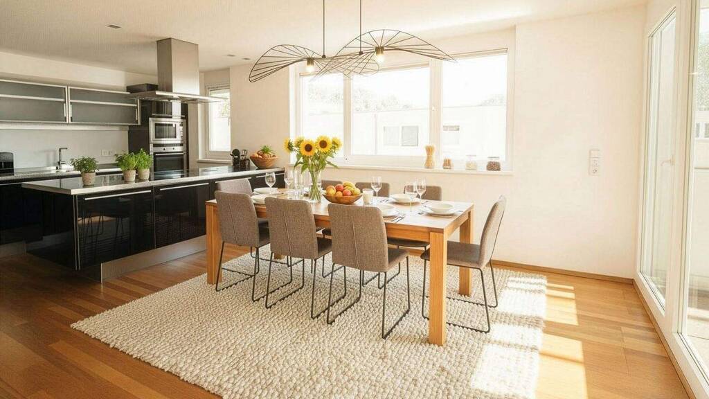 Das Zentrum der Wohnung bildet der großzügige, lichtdurchflutete Wohn-, Ess- und Kochbereich. Die offene Küche ist mit Einbaugeräten ausgestattet und bietet viel Platz für die gesamte Familie – perfekt für gemeinsame Kochabende und gesellige Stunden. Große Fensterflächen sorgen für eine angenehme Wohnatmosphäre und viel Tageslicht.