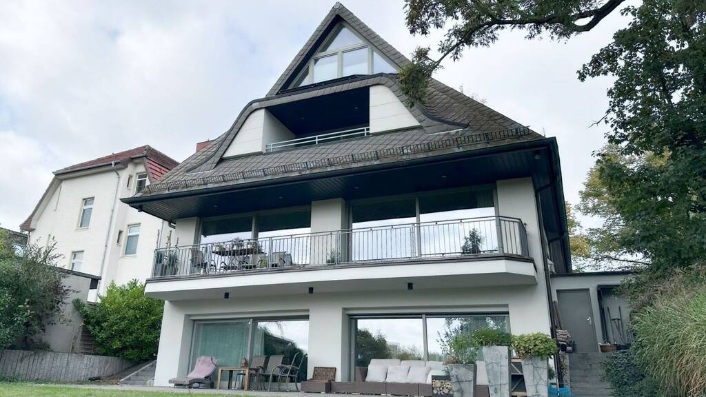 Zehn großzügige Zimmer und fünf Badezimmer erstrecken sich über die vier Geschosse und zwei Balkone sowie die große Terrasse bieten direkten Blick auf das Wasser und den großzügigen, nach Süden ausgerichteten Garten - eine harmonische Verbindung von Natur und Wohnkomfort. Ein besonderes Highlight ist das große, lichtdurchflutete Souterrain, das über seine bodentiefe Verglasung direkten Zugang zu Terrasse und Garten bietet - ideal als Wohnbereich, Hobbyzone oder Home-Office.