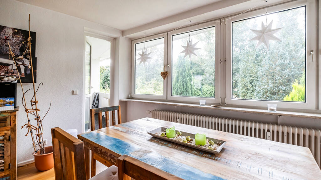Ein weiteres Highlight ist der Balkon, der sich ideal für unterschiedliche Anlässe eignet - sei es für ein gemütliches Frühstück im Freien oder entspannte Abende. Durch seine Ausrichtung ermöglicht er eine angenehme Nutzung zu jeder Tageszeit und bietet einen schönen Blick auf die Umgebung.
