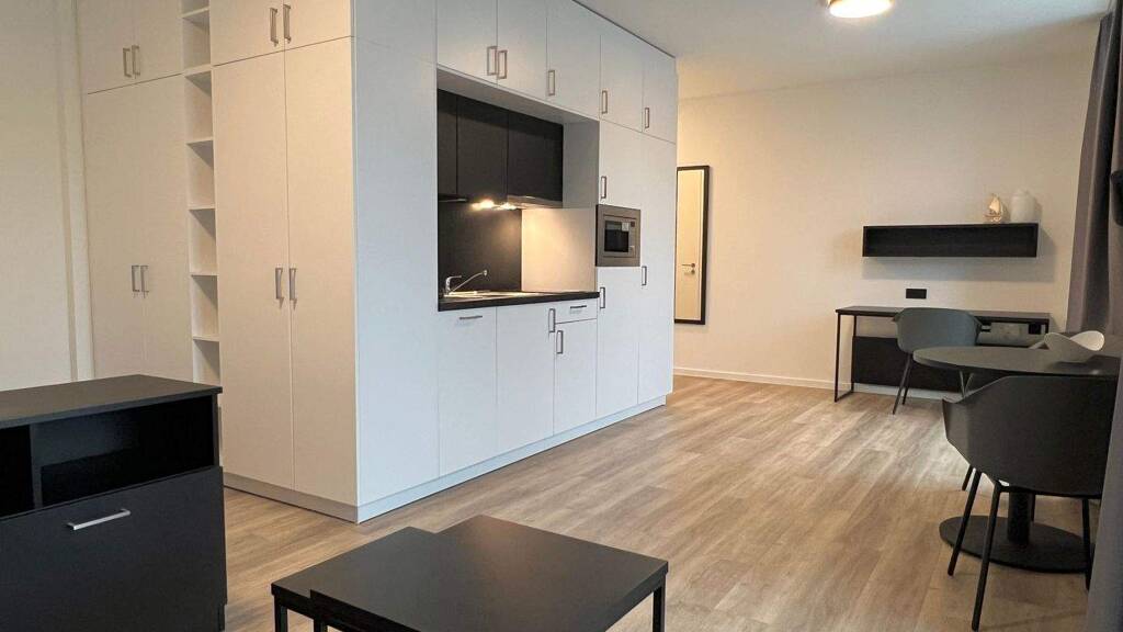 Kompakte Küchenzeile: Die integrierte Küchenzeile ist mit allen notwendigen Geräten ausgestattet, darunter ein Kühlschrank, ein Kochfeld, eine Spülmaschine und eine Mikrowelle. Zusätzlich stehen Dir eine Kaffeemaschine, ein Wasserkocher sowie Besteck und Geschirr zur Verfügung - ideal für den direkten Einzug ohne Aufwand.