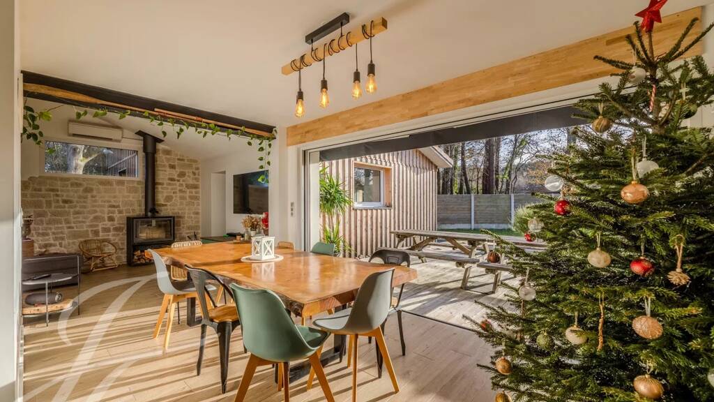 L'espace de vie s'ouvre sur une entrée accueillante, suivie d'un séjour lumineux doté d'une baie vitrée à galandage de 4 mètres, offrant une vue dégagée et apaisante sur la forêt et la piscine. Cette perspective sur la nature confère à la maison un véritable sentiment de sérénité.