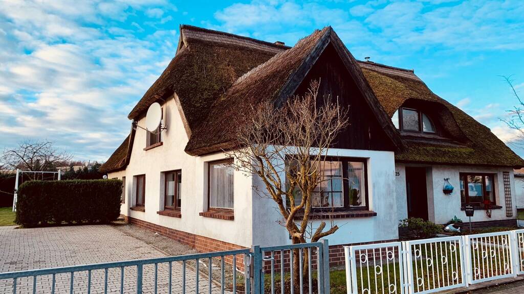 Hier angeboten wird ein Reetdachhaus in Strandnähe. Das Angebot besteht aus einem massiv errichteten Haupthaus mit einer Wohnung zur Eigennutzung, einer als Ferienwohnung genutzter Einliegerwohnung, einem Nebenhaus sowie einem Garagenkomplex. Eine umfassende Sanierung fand in den 70er-Jahren statt. Die Sanierung umfasste die Erneuerung des Mauerwerkes durch Ziegel und Gasbetonsteine sowie die Erweiterung des Haupthauses durch einen hofseitigen Anbau mit Unterkellerung. Ende der 90er-Jahre wurde das Dachgeschoss ausgebaut und somit eine zweite Wohnung geschaffen.